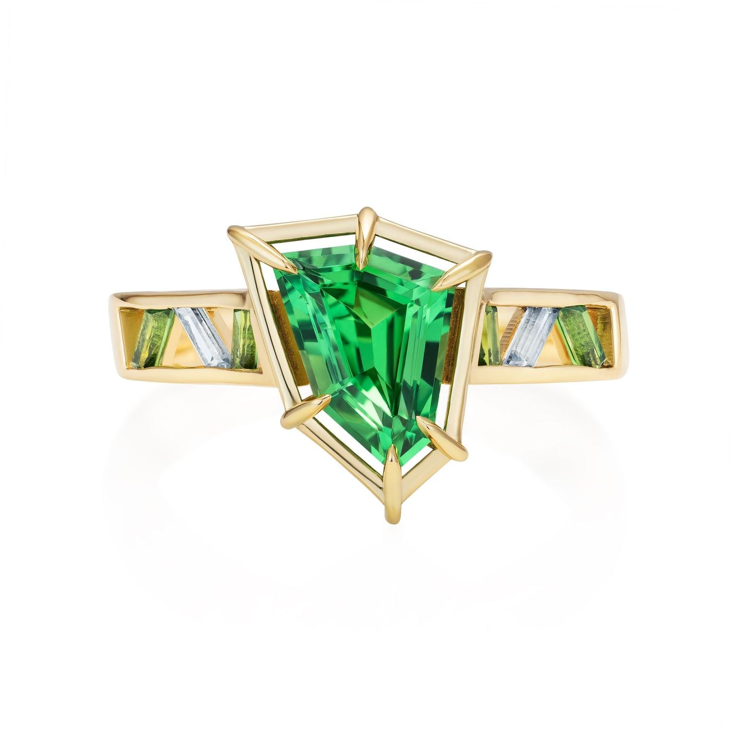 With a central 1.70cts Tsavorite garnet, freeform 6 sided cut, six claw set, with white sapphire and tsavorite garnet shoulders. Made in 18ct Yellow Gold.Central Tsavorite: 1.70cts