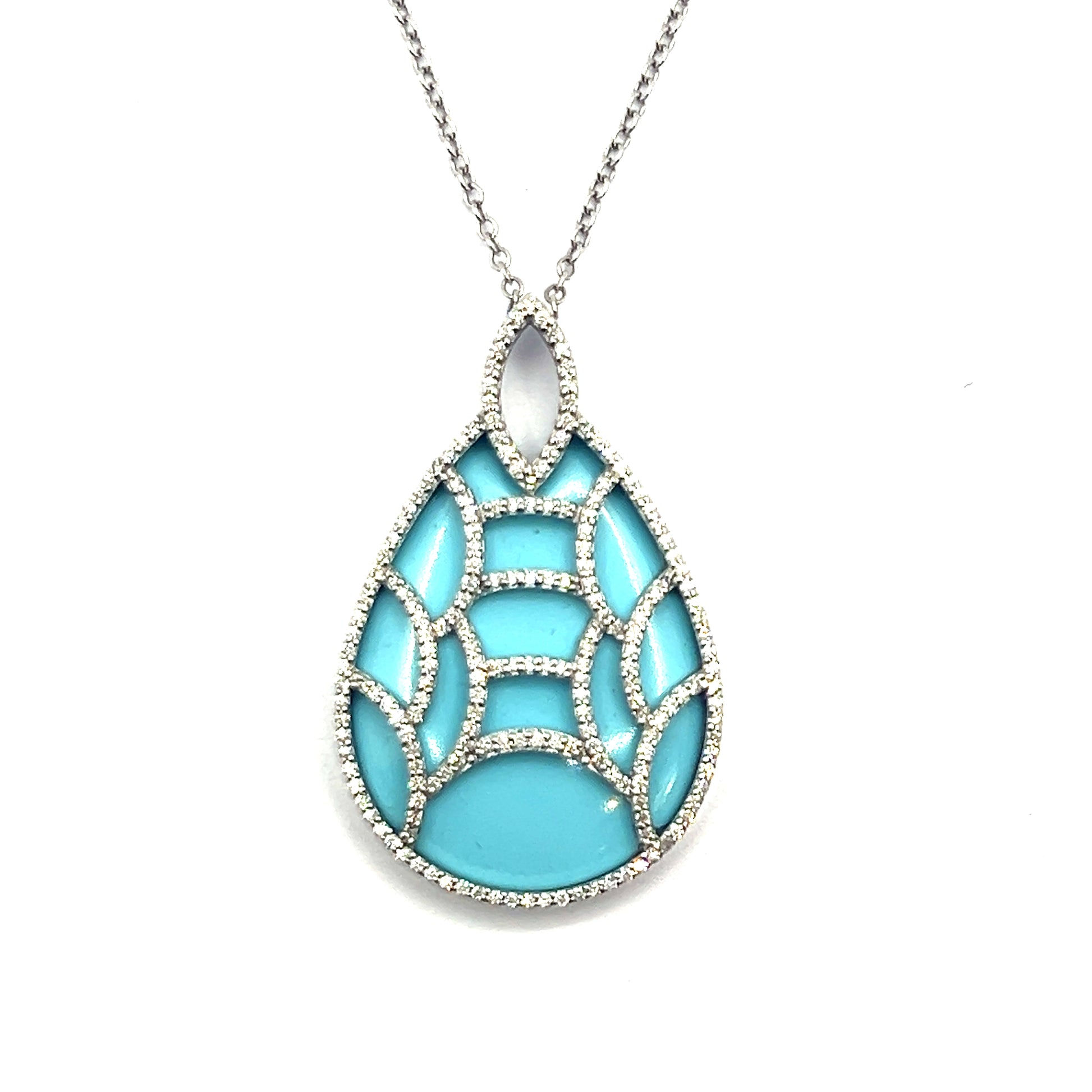 18ct White Gold Teardrop Turquoise and Diamond Pendant Necklace