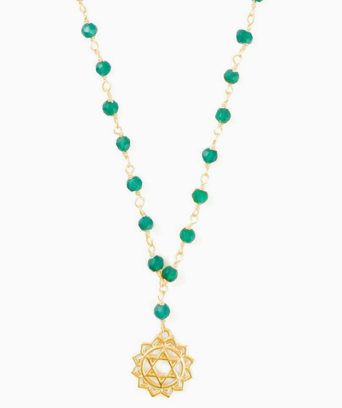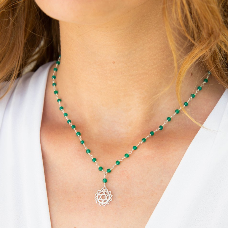 LOVE. HEALING. COMPASSION. Compassion heart chakra gemstone pendant necklace The Anahata chakra necklace is a magical piece of jewellery that will fill the heart with love. The perfect spiritual jewellery gift for romantic celebrations, it features a heart chakra pendant suspended on a chain of faceted green onyx beads. Handmade and beautifully presented, this heart chakra pendant pairs elegantly with business attire, casuals, and everything in between. The heart chakra, Anahata, is the chakra of unconditional love, compassion, and joy. It is the fourth primary chakra, located in the centre of the chest, and it serves as a bridge between the upper and lower chakras.