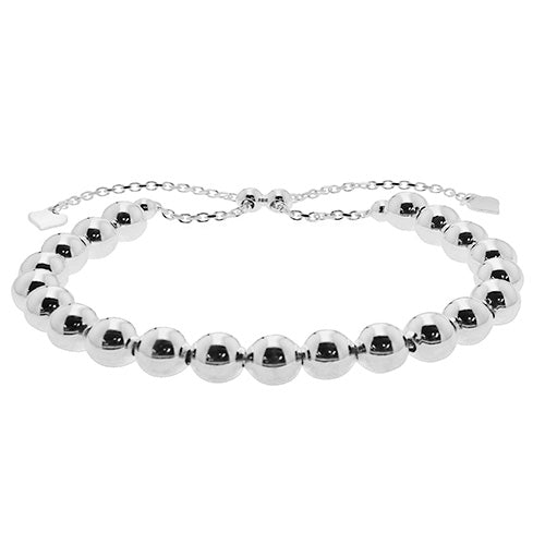 6mm silver ball beads are strung on a sterling silver chain with an adjustable pulley mechanism so the bracelet can be extended and retracted with ease