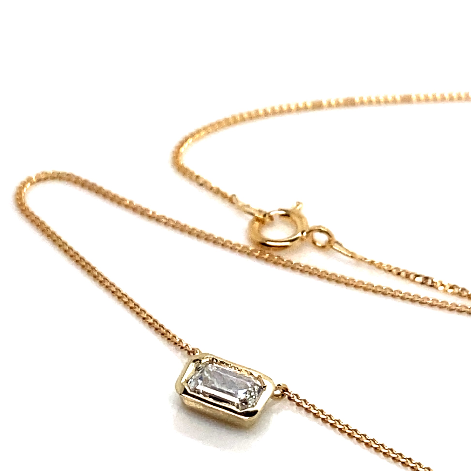 0.30cts emerald cut diamond set horizontally in a rubover pendant mount, attached to a fine 9ct yellow gold close curb chain 16". Lab grown diamond quality: D colour, VVS2 clarity.
