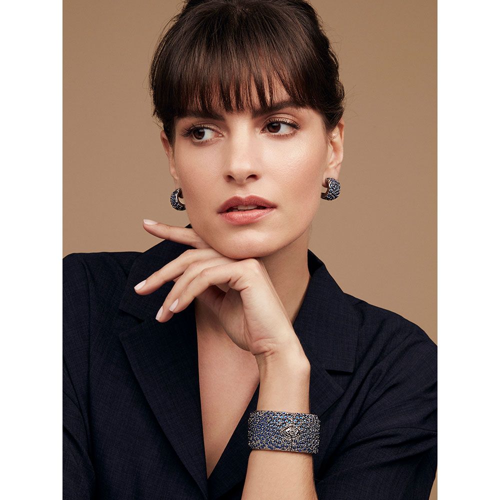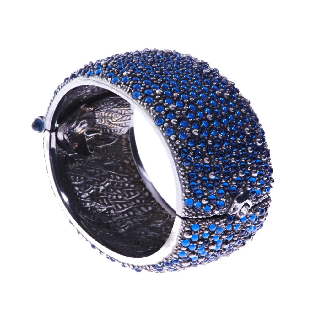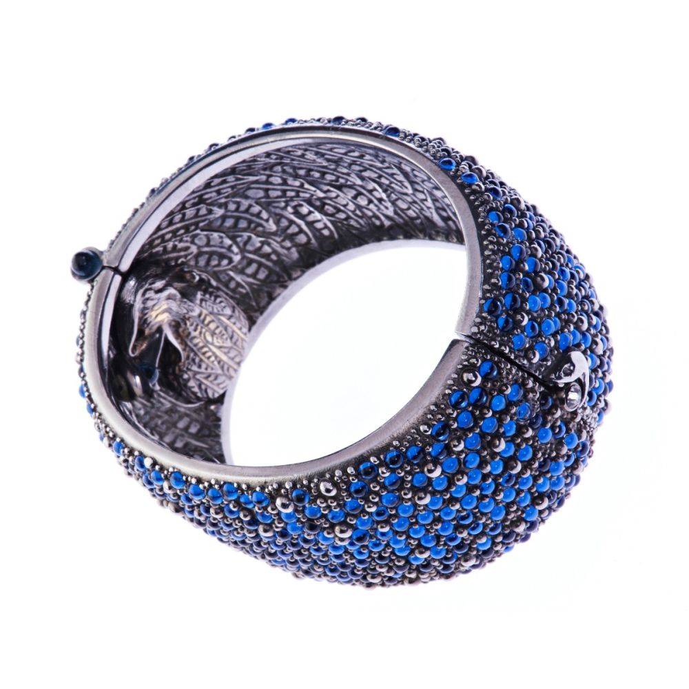 This hand-crafted bangle is covered in hundreds of dark sapphire coloured cabochon stones and Swarovski ® crystals. Creating a highly textual surface that represents the natural texture of the eagle ray's skin. The underneath features base relief details with a beautiful eagle ray carving.