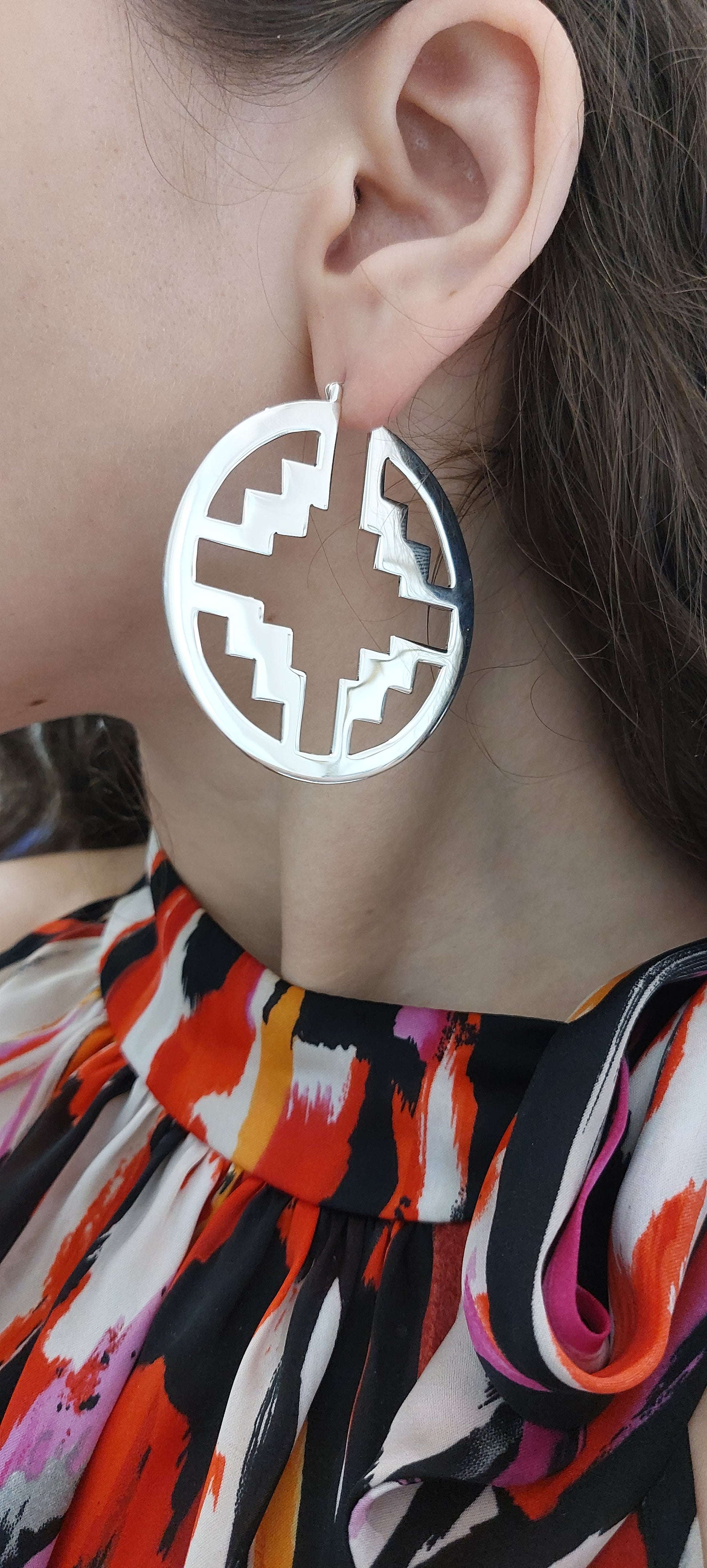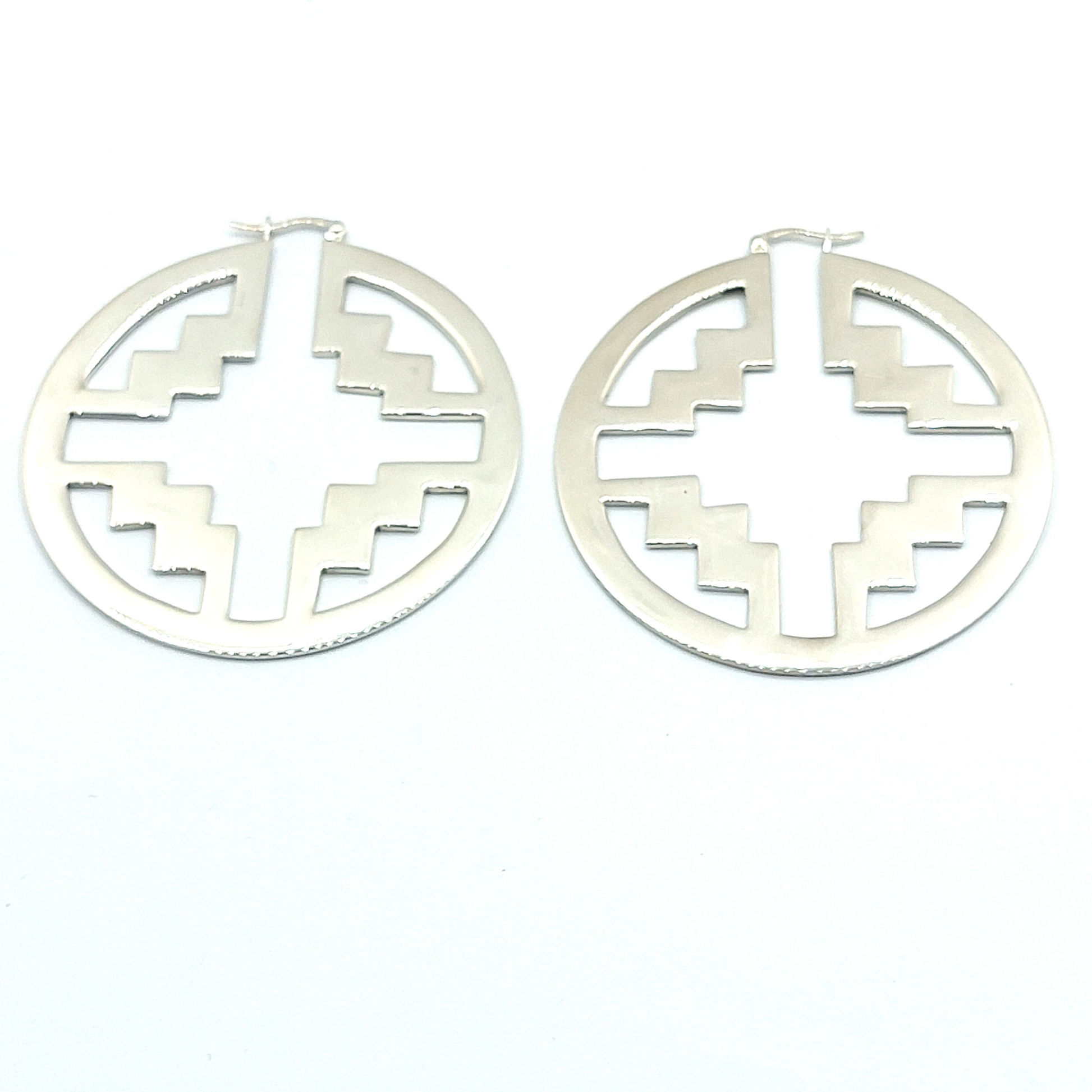 These incredible disc earring are a stunning example of a geometric Aztec style design in solid Sterling Silver.