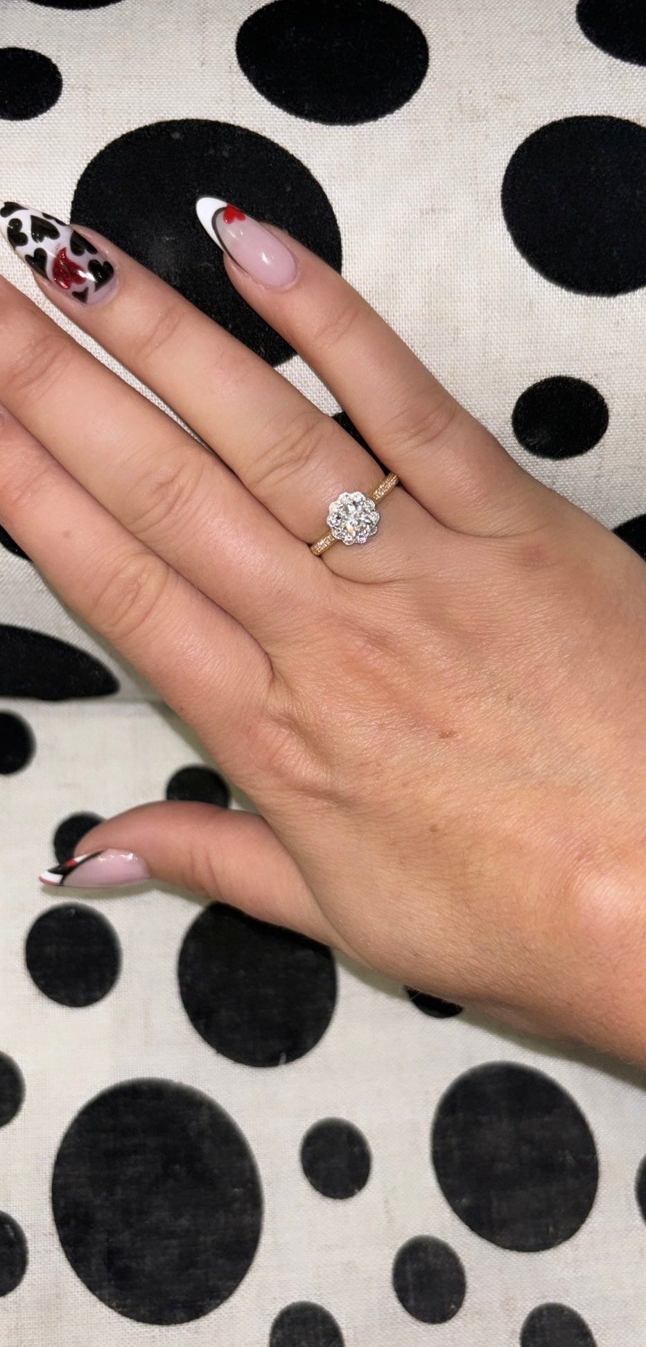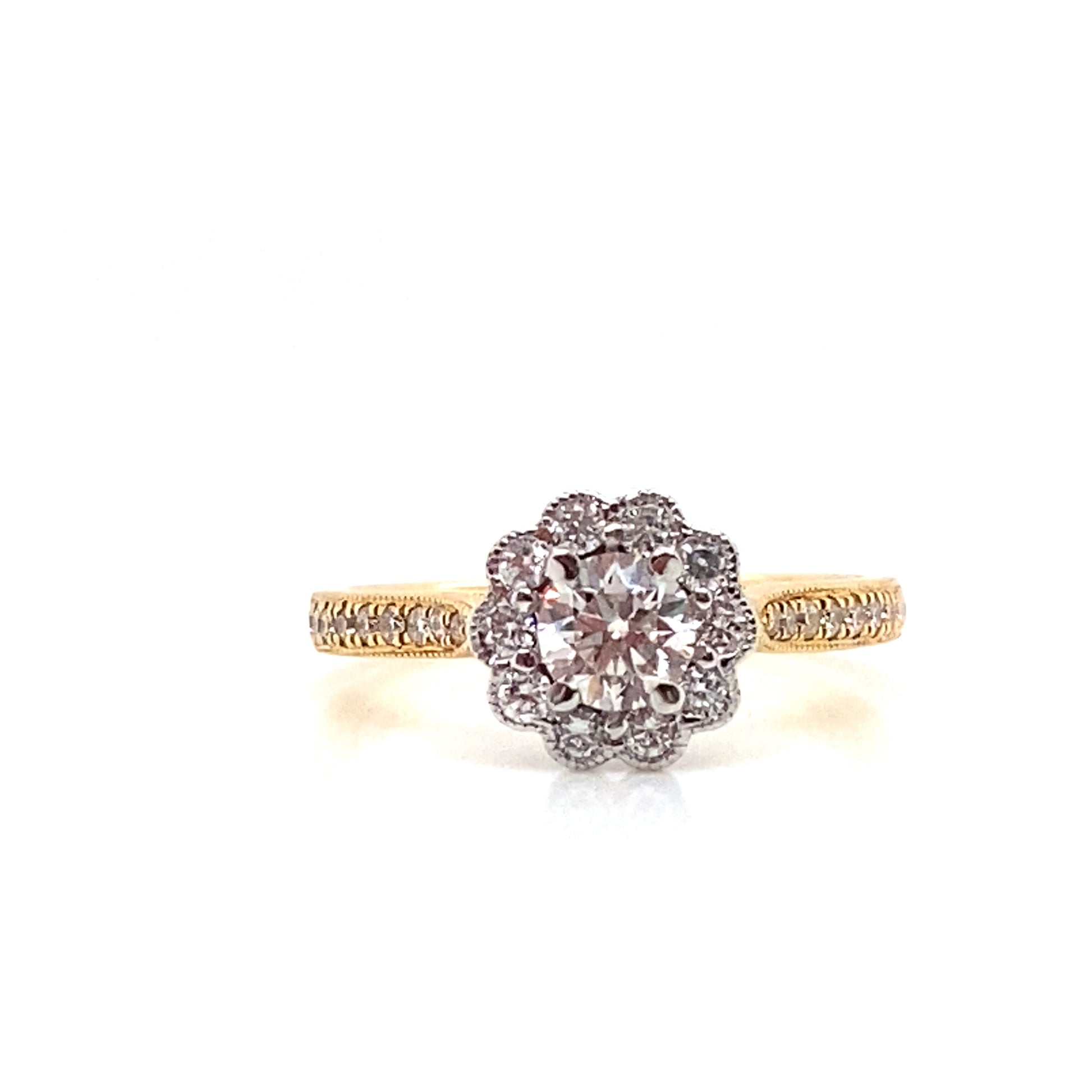 0.40ct Round Brilliant Cut Diamond set within a Scallop Set diamond halo in 18ct Gold. White gold topped with a diamond grain set band