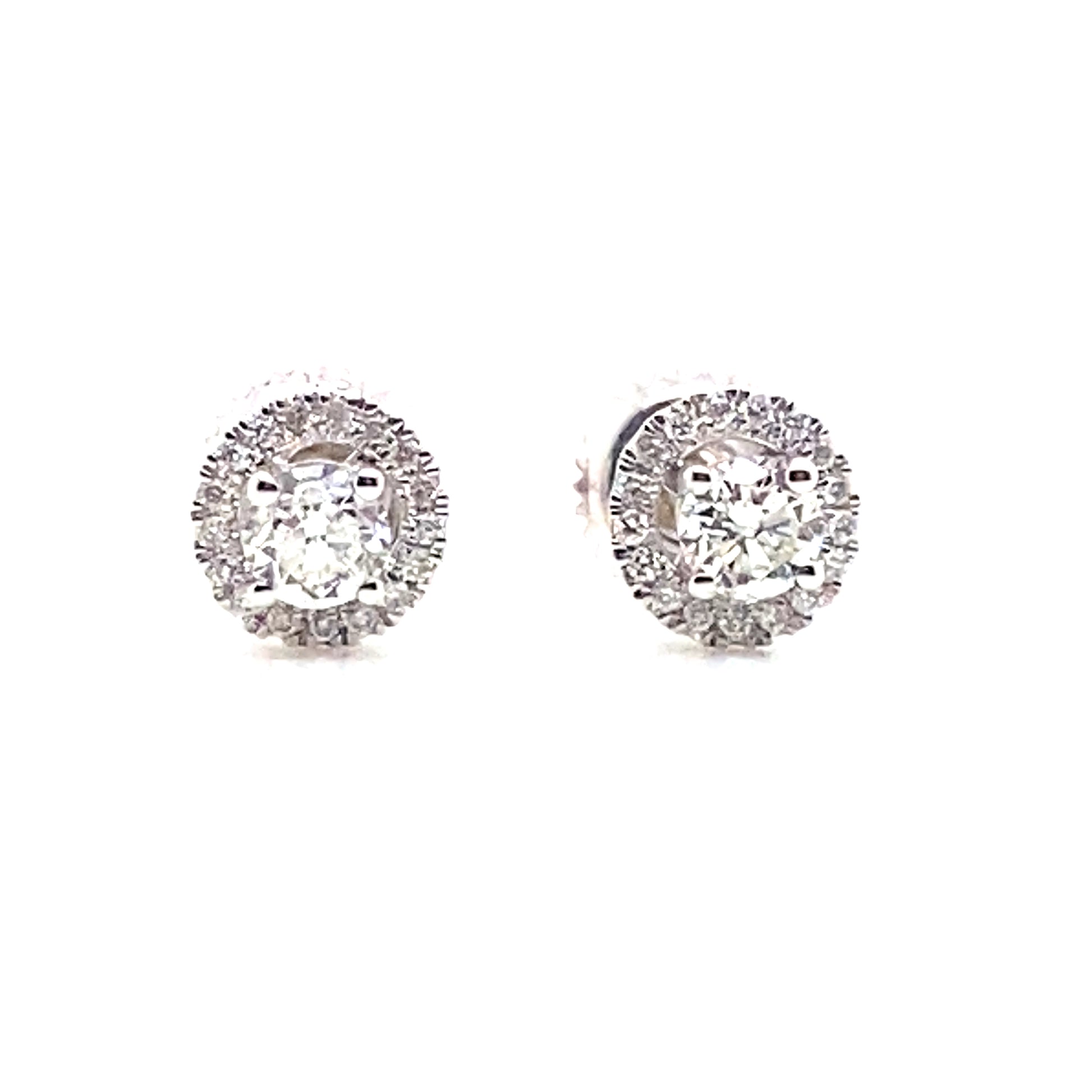 Round Brilliant Natural Diamond Stud Earrings, 0.39cts with Removable Halo, 0.11cts in 18ct White Gold with Screw Backs. 3.55mm stud 6.5mm halo makes the whole earring the spread of a 1ct diamond.