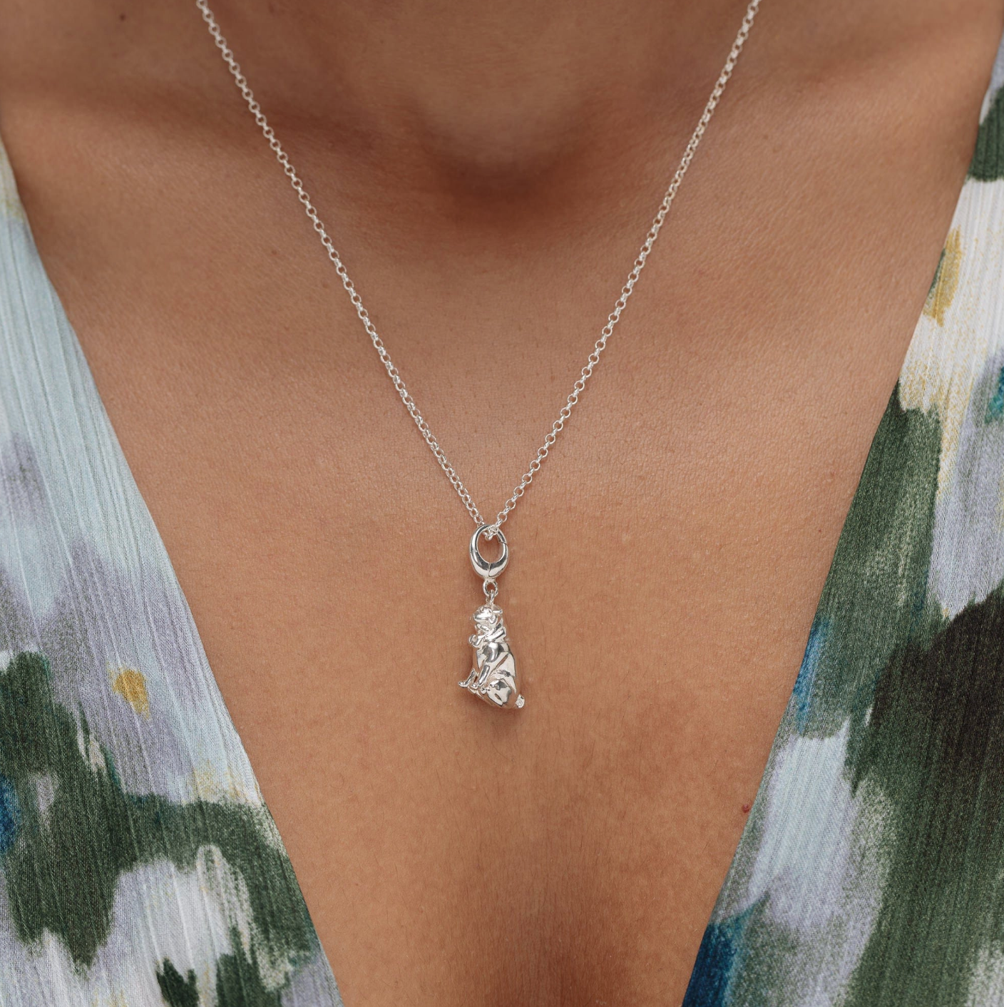 Our adorable sterling silver pug charm is superbly detailed, highlighting the lovable nature of this popular breed. From the instantly recognisable pug face to the bow tie detailing, this little chap will bring joy to any dog lover.