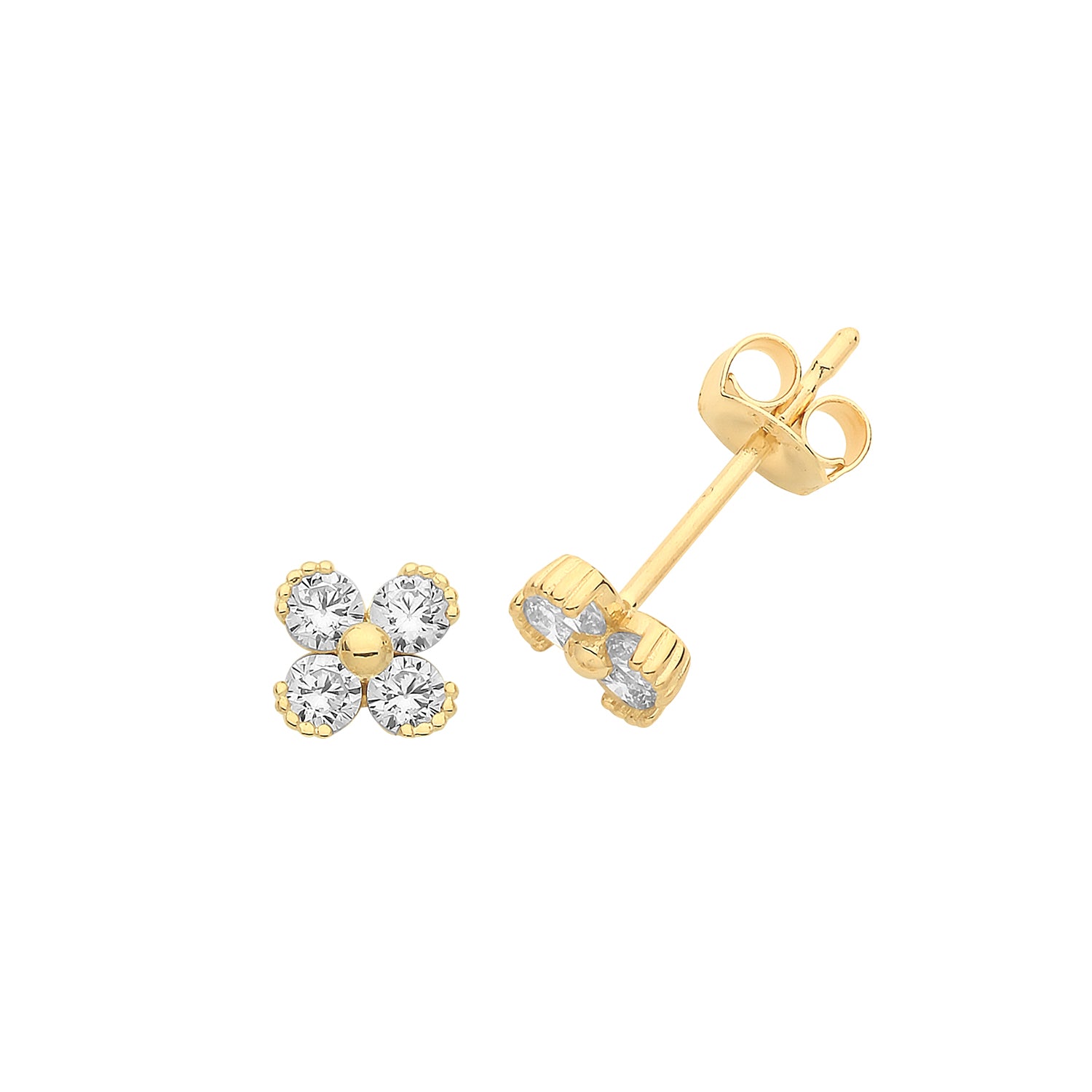Sparkling 4 Petal Flower 9ct Yellow Gold Stud Earrings Set with Cubic Zirconia.