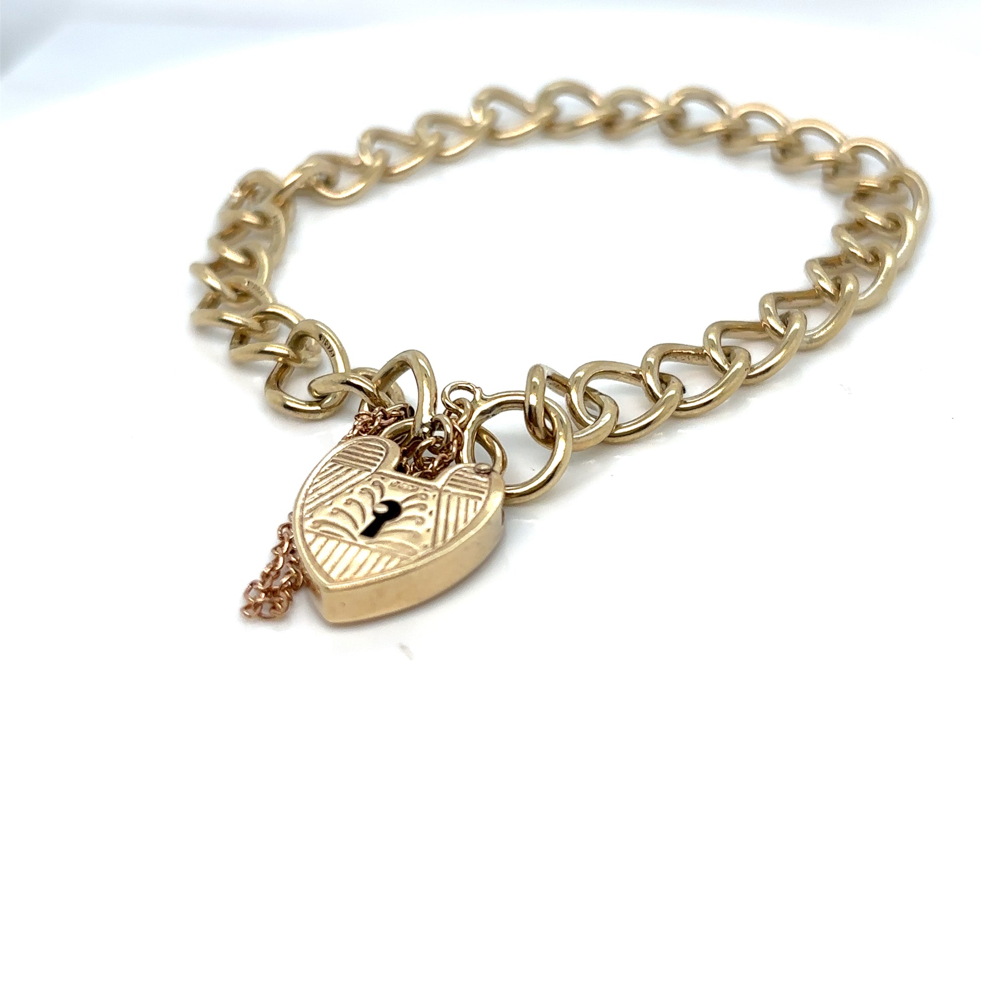 This bracelet is a gorgeous, solid gold bracelet. It has a heart padlock fastening (with safety chain) and is in impeccable condition; newly lightly polished