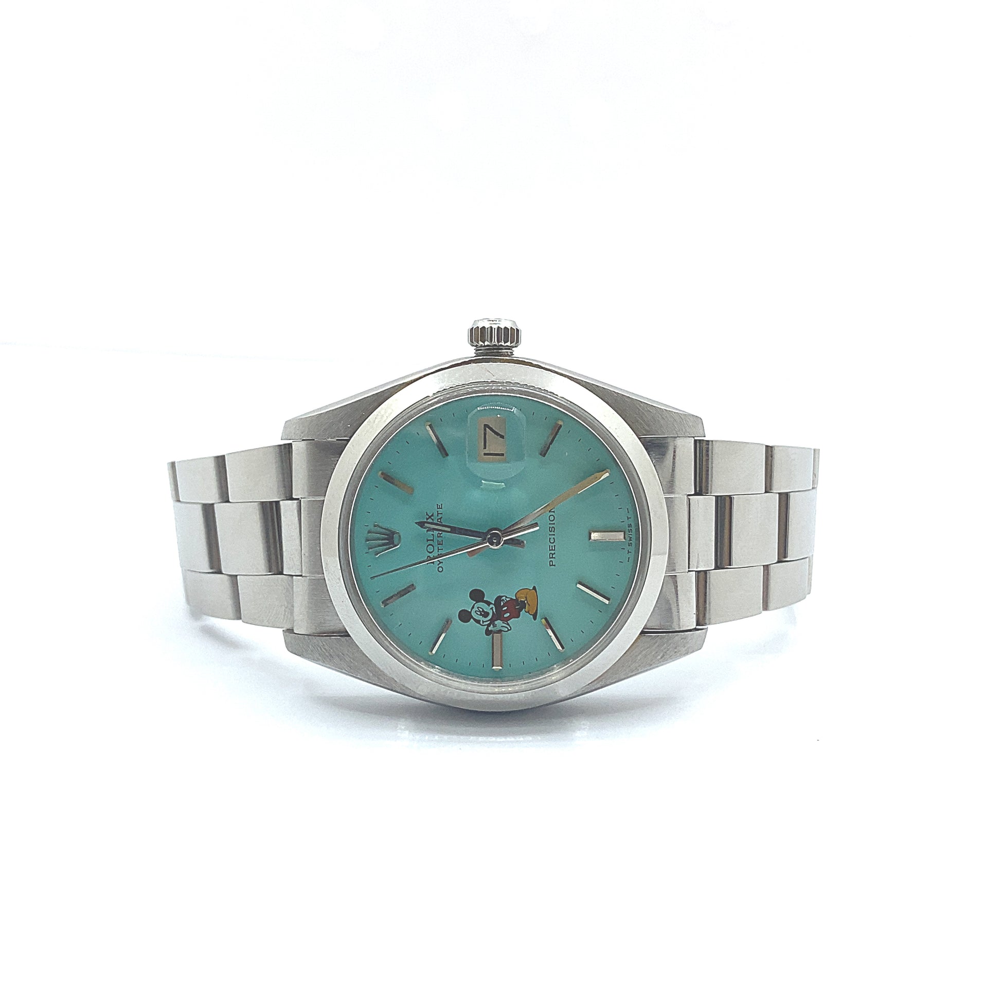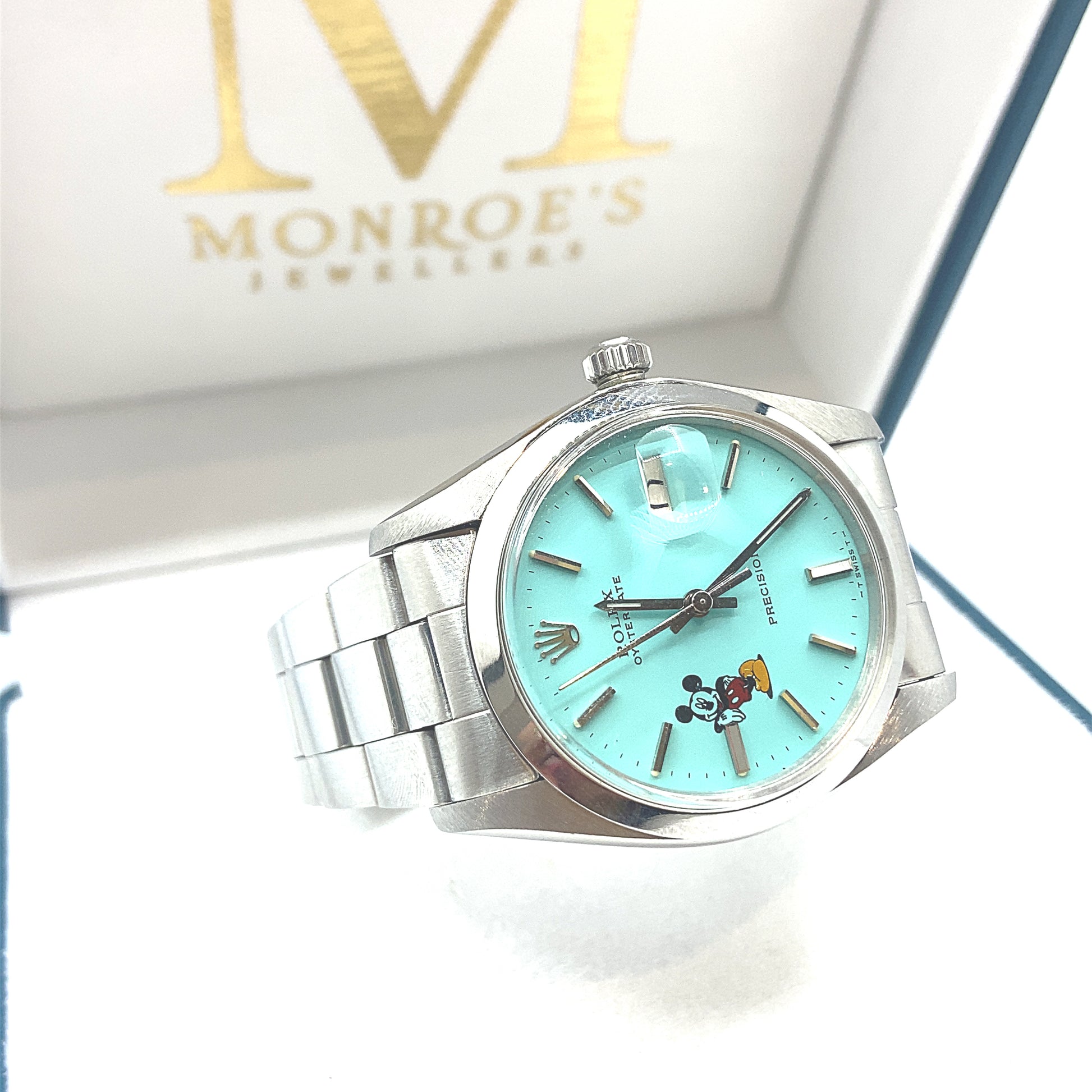 This Rolex has a customised dial in Aqua Blue with Mickey Mouse positioned at 9pm